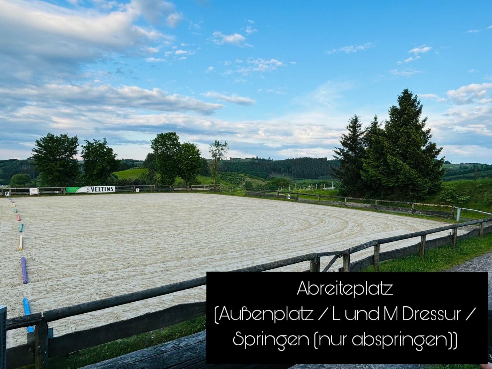 In diesem Jahr werden die L und M Dressur und Springprüfungen auf unserem Außenplatz stattfinden. Für die L und M Dressur wird ein passendes Dressurviereck aufgebaut. Abgeritten wird für die L und M Dressur ebenfalls auf dem Außenplatz in einem abgetrennten Bereich. Für die Springreiter wird der obere Abreiteplatz zum abreiten genutzt und der abgetrennte Bereich auf dem Außenplatz zum abspringen.