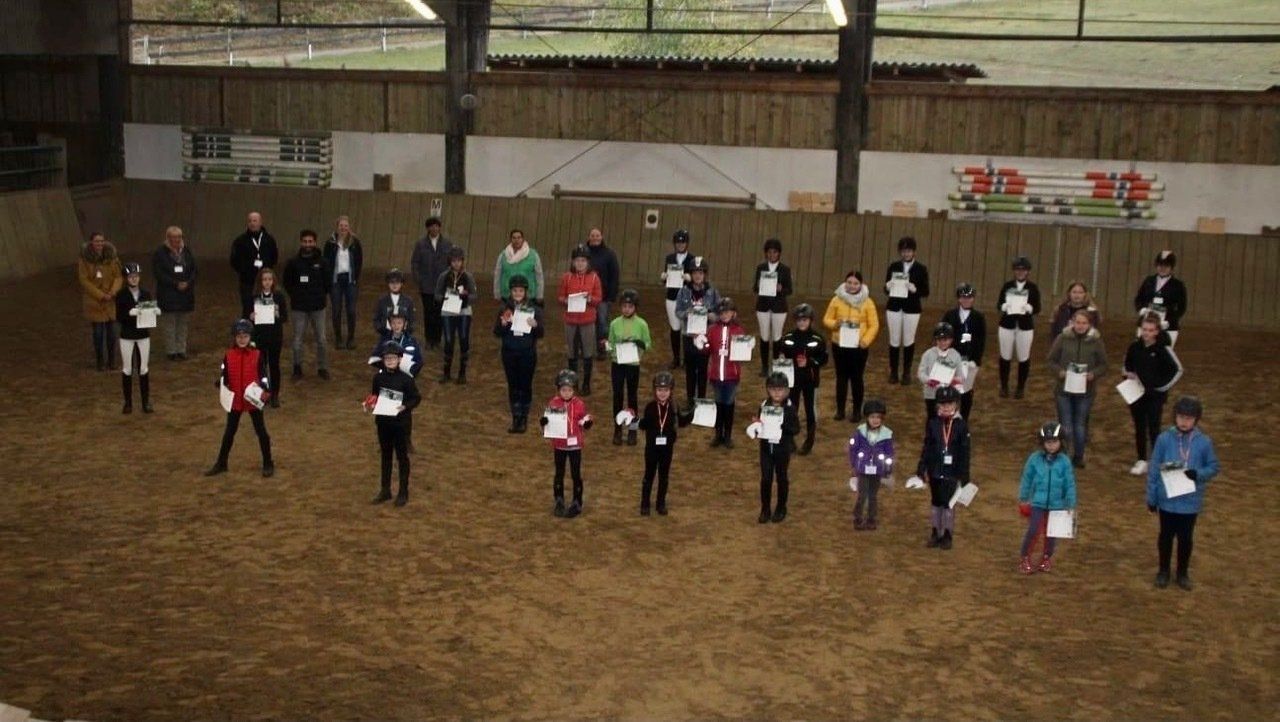 Bereits im Februar startete ein Vorbereitungslehrgang zum Pferdeführerschein und den verschiedenen Reitabzeichen 10 bis 3. Nach einer fünf-monatigen Zwangspause durch das Corona-Virus wurde der Lehrgang unter Leitung von Sven Brüggemann und seinem Team im August wieder aufgenommen. Am 26. September 2020 stellten sich dann 35 Teilnehmer in 40 Prüfungen der Aufgaben und Parcours. Die Richterinnen Elke Schwarz und Henriette Ellerbrock bescheinigten den Prüflingen eine gute Vorbereitung. Schweren Herzens erfolgte die Urkundenübergabe für alle kontaktlos und mit dem nötigen Corona-Abstand.